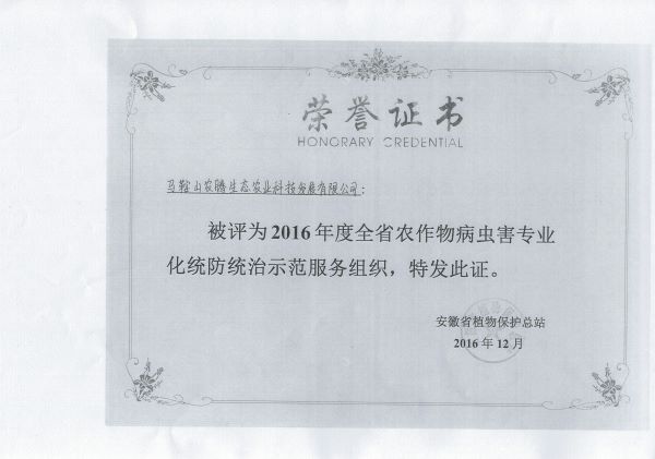 病虫害专业防治荣誉证书